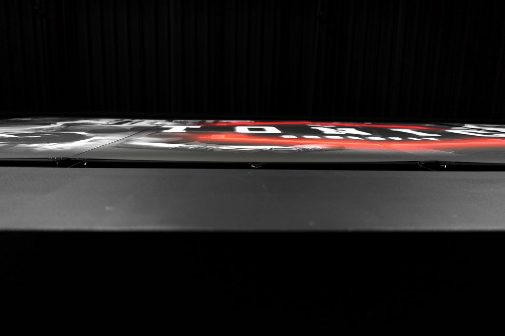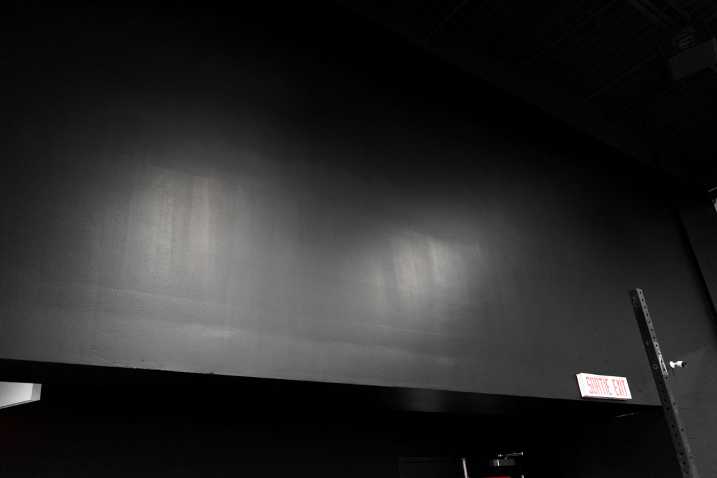 La principale raison pour laquelle nous voulions – et devions – installer une si grande murale est simple. Le mur sur lequel nous avions choisi de l’accrocher fait 32 pi de large par 20 pi de haut. Puis, j’ai suivi la vision de Gabriel: un montage personnalisé noir et blanc avec un logo rouge au centre. Les bordures ont un dégradé progressif vers le noir afin de créer une fusion visuelle avec le mur de la même couleur.