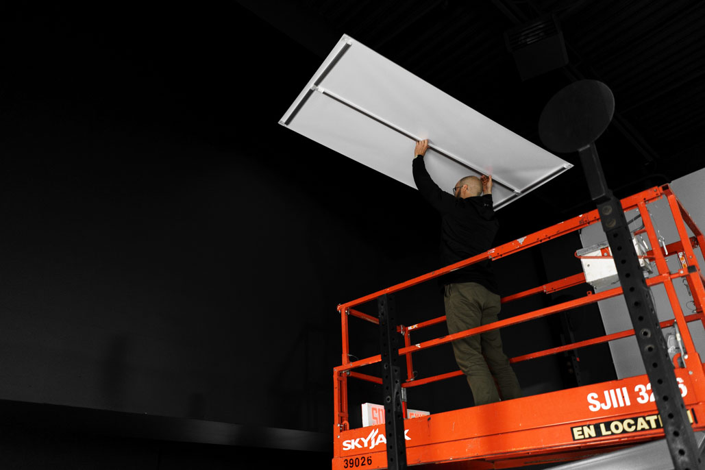 Il a fallu trois heures, un Skyjack et deux personnes et demie (deux hommes en pleine possession de leurs moyens ainsi que moi-même – qui correspond plutôt à moitié puisque je me promenais surtout en prenant quelques photos). Si vous pensez que je n’aurais pas pu le faire toute seule, JE VOUS DONNE ENTIÈREMENT RAISON.