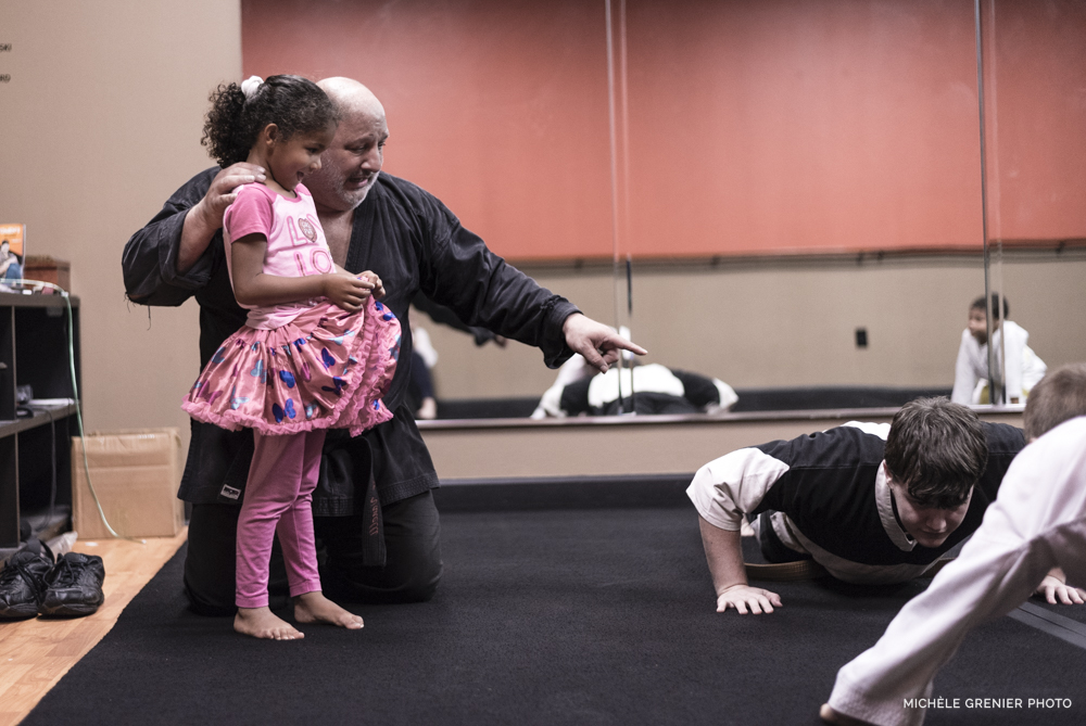 Comme vous l'avez peut-être lu dans le précédent article "Le saut en hauteur: comment j'ai réussi cette photo", j'adore prendre mes photos en contre-plongée. J'ai pris des photos spontanées en action durant la pratique du groupe et beaucoup de clichés d'interactions entre Vanelli et ses étudiants. Je voulais illustrer la passion qui brûle toujours en lui malgré toutes ces années de pratique en karaté. Je cherchais aussi à montrer à quel point ses élèves s'amusaient et prenaient plaisir à être avec leur professeur.